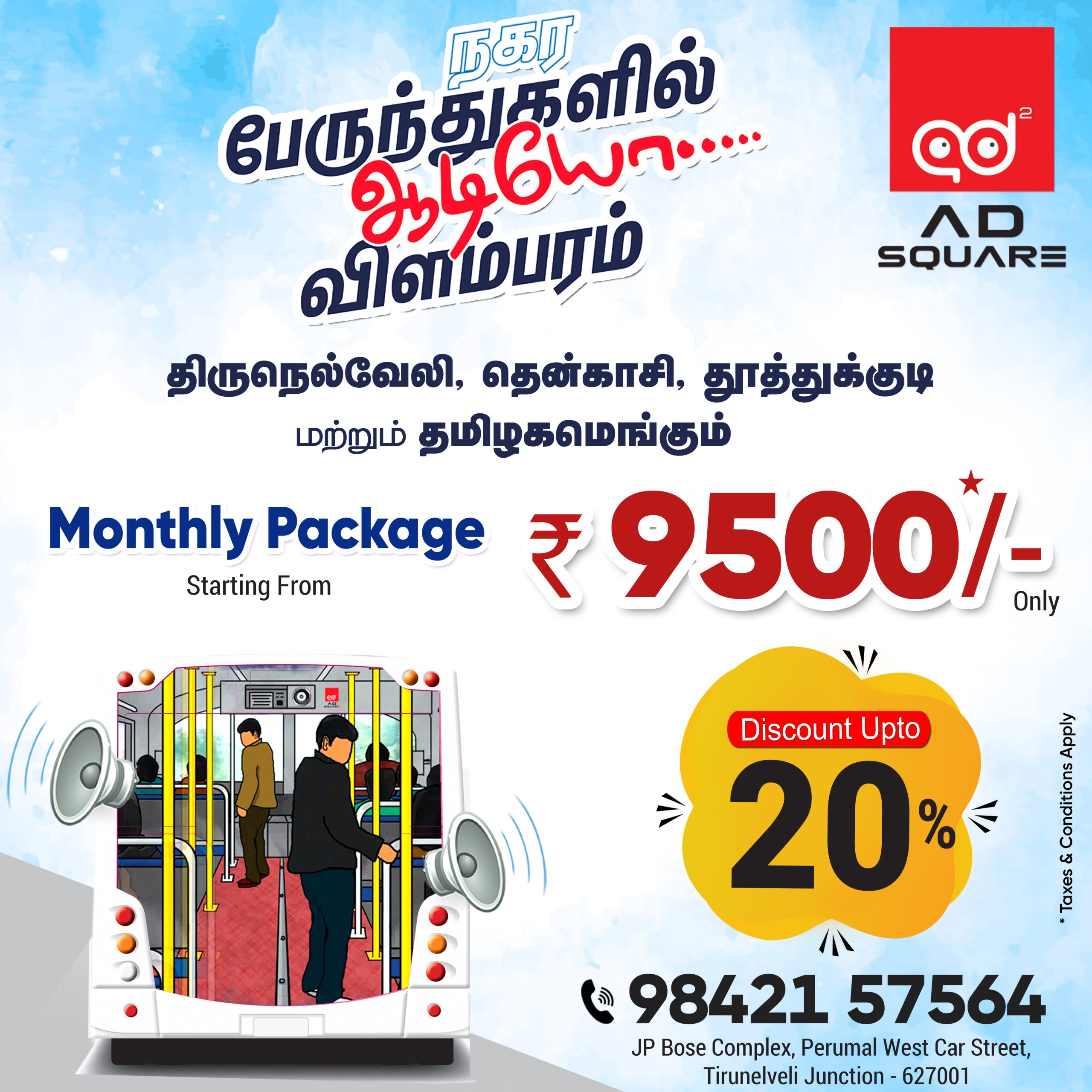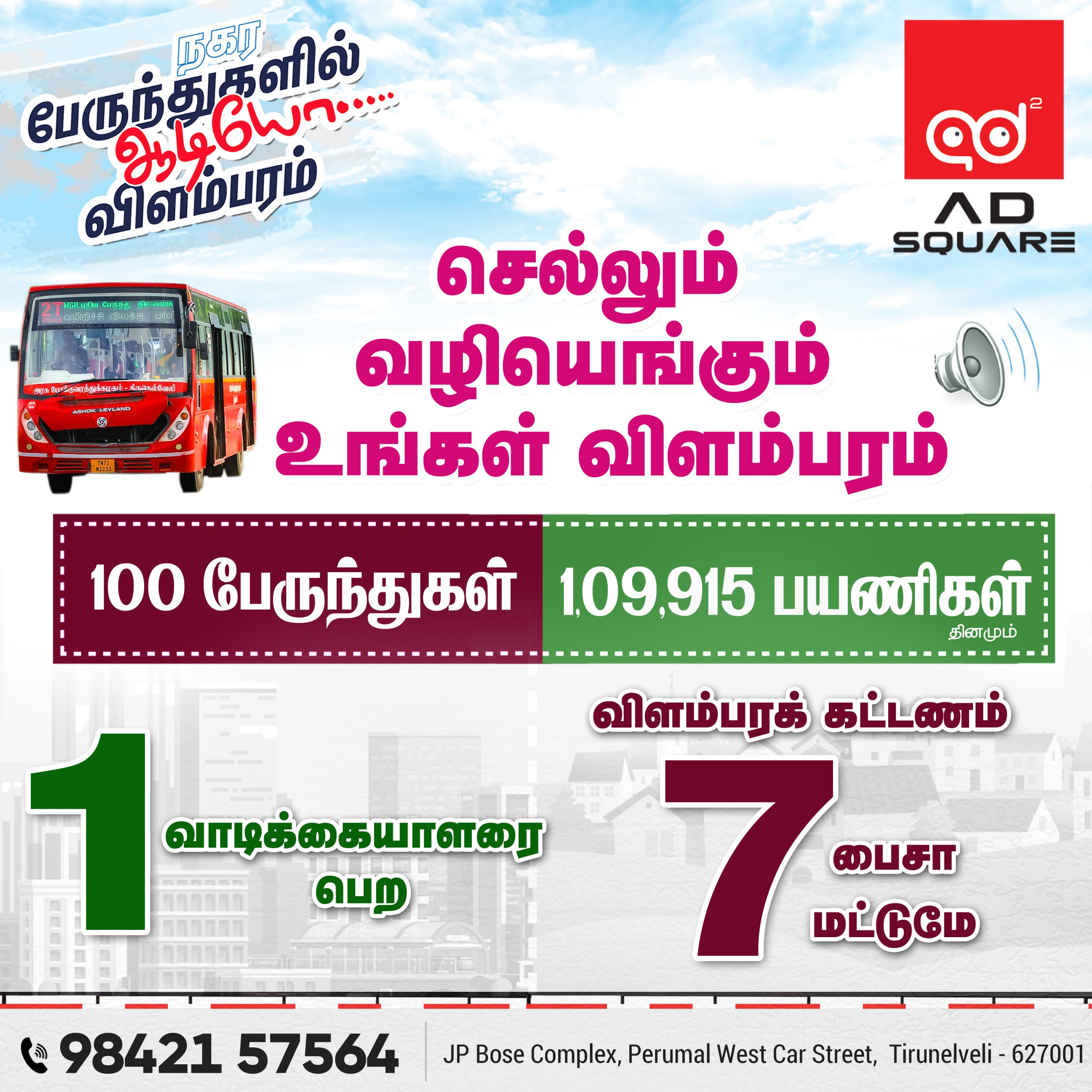 Adsquare is one of the innovative outdoor advertising agencies in Tirunelveli, Tamilnadu, that brings immense and huge increase to your brand audience with its professionalism. We provide services like Bus Audio Ad, Railway advertising, outdoor advertising , busback advertising at affordable cost and in effective manner.